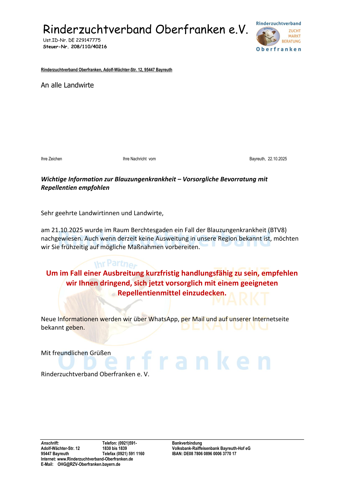 Am 21. Oktober 2025 wurde ein BTV-8 Fall in Bayern festgestellt. Daraufhin wurde Oberbayern und Niederbayern zur Sperrzone erklärt.